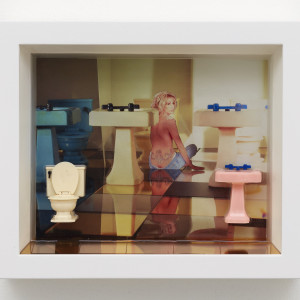 In this particular exhibition, Simmons has redesigned a series she created over a decade ago, in which she saved and printed out images of women from amateur-pornography websites. Taking these cut-outs, she posed each woman alongside dollhouse sets and furniture under David Lynch-esque lighting, essentially creating her own paper dolls. These tiny toilets, instruments, and other objects were photographed with women arranged in various positions, some of them adorned with colorful drawings or small decor to cover their bodies. While Simmons’ original intention was to print each image out as large-scale photographs, it never came to fruition with the trajectory of her work at the time.