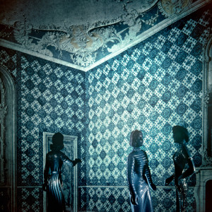 In Color Coordinated Interiors, 1982–83, Simmons broke with traditional photographic paper sizes for the first time and used medium- and large-scale formats. This body of work investigates the formal characteristics of color, shape, and light by returning to the artist’s now familiar motif of staged plastic figurines. Monochromatic red, green, yellow, and blue plastic “teenette” dolls made in Japan are set against two-dimensional backdrops projected from slides. Experimenting in the days before digital photography and Photoshop, Simmons shot the backgrounds with Kodachrome film and then used the slides to create rear-screen projections (a technique of cinema). She would then stage the dolls, shoot the set-ups with color film, and wait to get the images back from the printer to see the outcomes. “It wasn’t until I started editing that I could see that some figures in front of the rear-screen projections worked beautifully and others failed miserably. What I mean by ‘worked’ is that every once in a while, the figures were totally integrated into the backgrounds and looked like they were actually standing in the rooms.”