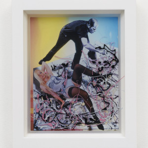 In one photograph titled Jackson Pollock, a woman is splayed out seductively over a canvas of Jackson Pollock’s, where he stands above her, attempting to paint in his infamous drip technique. Using the resin as a form of layering, Simmons creates her own drip technique to further embed the woman into the space and the visage of a muse for painting. In another titled Green Clay Bikini/Piano, a woman is covered by a clay bikini, made by Simmons, and sits in front of a piano while she masturbates. Included are miniatures of a lamp and vase on top of the photographed piano, as well as a tiny piano stuck in caddy-corner positioning by the resin. The indentations these objects make in the material resemble that of plastic packaging with accessories for a doll.